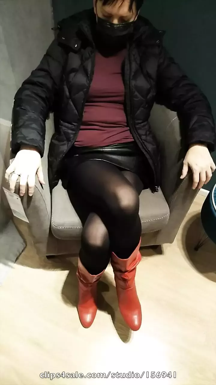 Fully dressed crossed legs orgasm in a store
