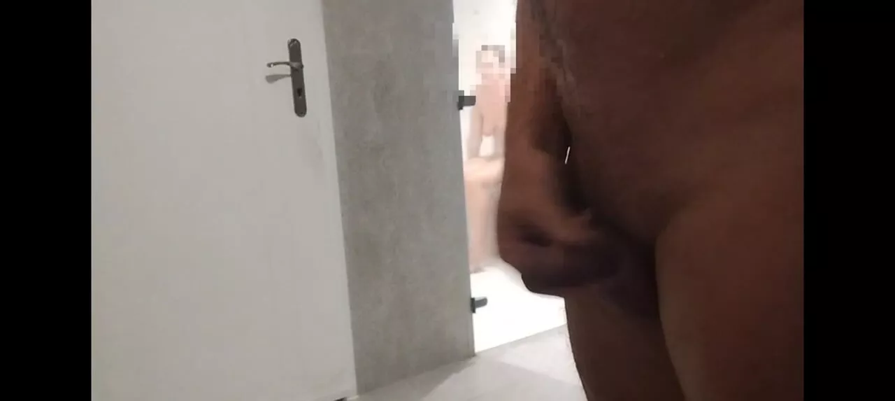 dickflash in the sauna shows the dick to the woman in the sauna she can't stand it anymore and plays with the dick