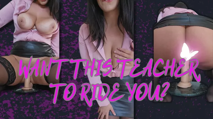 Busty MILF Teacher in leather skirt practices her riding skills using her Dildo